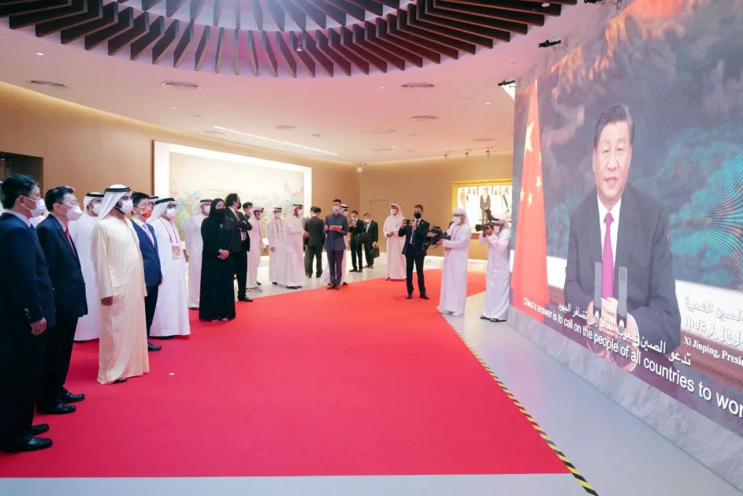 活动现场,首先播放了习近平主席为中国馆发表的视频致辞,之后部分嘉宾发表简短致辞。迪拜世博会中国馆政府总代表、中国国际贸易促进委员会副会长张慎峰,中国驻阿联酋大使倪坚,中国驻迪拜总领事李旭航,国际展览局秘书长迪米特里·科肯切斯,阿联酋航空公司主席兼董事长赛义德·阿勒马克图姆,迪拜警察局总司令阿卜杜拉·迈利等中外嘉宾悉数出席。随后,出席仪式的嘉宾为中国馆剪彩并巡馆。